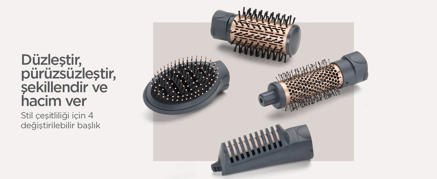 Ultra hızlı kurutma ve şekillendirme için 1000 W gücünde hava üflemeli saç şekillendirici seti. Kurutma, hacim verme, pürüzsüzleştirme ve düzleştirme için 4 adet değiştirilebilir başlığı bulunur.