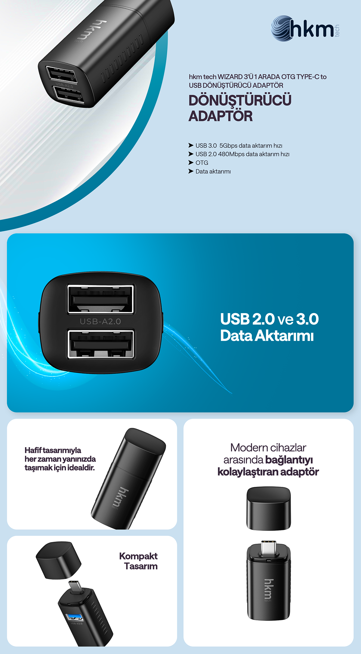 hkm Wizard 3 in 1 OTG Type-C to USB Adaptör, çok yönlü bağlantı özellikleri ve yüksek performansı bir araya getirerek işlerinizi hızlandırır. Şık tasarımı ve dayanıklı yapısıyla hem günlük hayatta hem de profesyonel ortamlarda en iyi yardımcınız olacak!