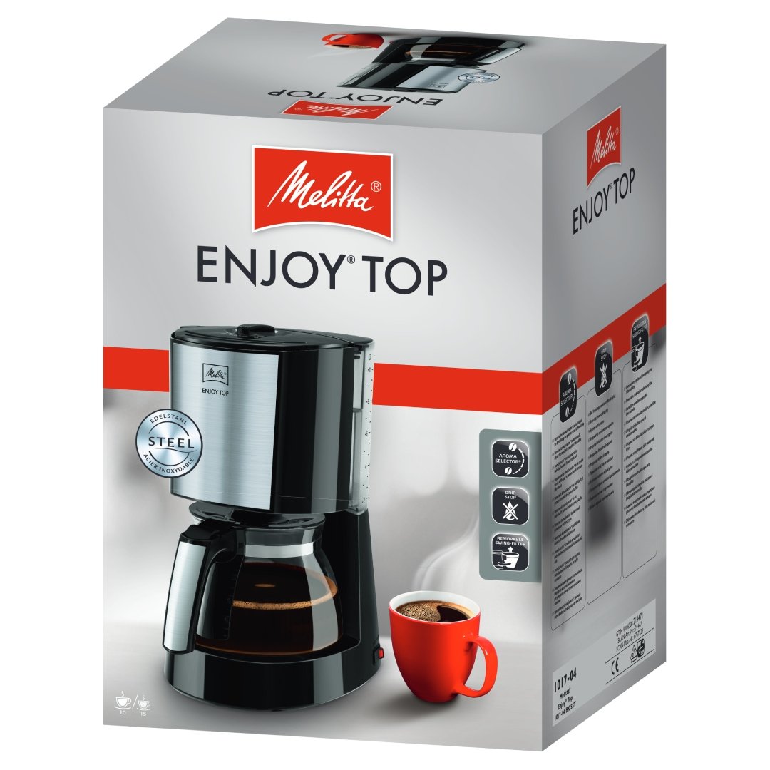 Melitta Enjoy Top sadece mükemmel tadıyla değil, aynı zamanda zarif paslanmaz çelik malzemeleri ve Aroma Selector özelliği ile de etkileyicidir. Bu özellikleri ile kahve yapmak daha da keyiflidir.